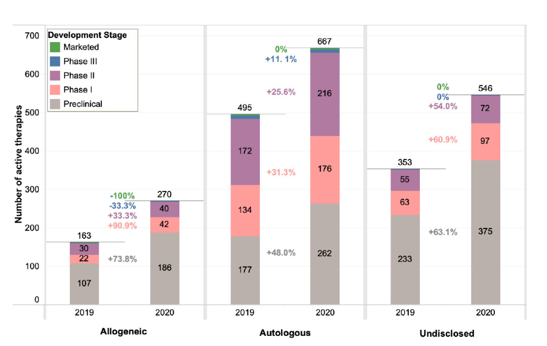 根据研究人员的统计,美国和中国在癌症细胞疗法的开发方面名列头两名。截至2020年3月,美国有600个开发中的疗法,中国的这一数字为508个。在美国,大多数细胞疗法由医药公司开发。在中国,过去大部分细胞疗法的开发工作在学术科研机构中进行,然而在去年,由医药公司开发的细胞疗法数目首次超过了由学术机构开发的疗法数目。从2019年到2020年,中国的临床前细胞疗法数目从69个增加到202个。中国处于1期和2期临床开发的癌症细胞疗法项目也在每年以大约50%的速度增长。