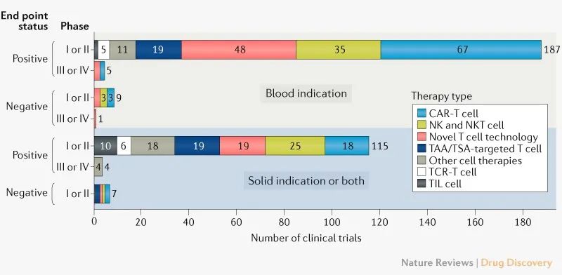 为了衡量细胞疗法在临床开发方面的进展,根据GlobalData的临床试验数据库,研究人员统计了已经发布试验结果的癌症细胞疗法临床试验。统计数据表明,在1期和2期临床试验中,大多数公布结果的试验都达到了试验的主要临床终点,负面结果的报告很少。值得注意的是,肿瘤浸润淋巴细胞疗法或天然杀伤细胞疗法在治疗实体瘤的1期或2期临床试验中都报告了积极的临床结果。而其它类型的细胞疗法,例如细胞因子诱导的杀伤细胞,在3期或4期临床试验中获得积极结果。不过研究人员同时也指出,失败的临床试验可能不会公布结果,因而对统计数据产生影响。