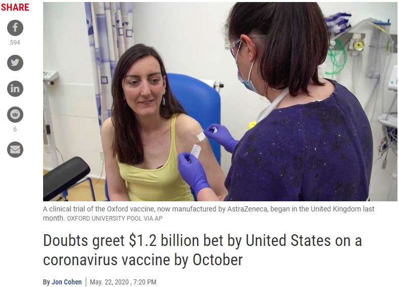 1.Doubts greet $1.2 billion bet by United States on a coronavirus vaccine by October.