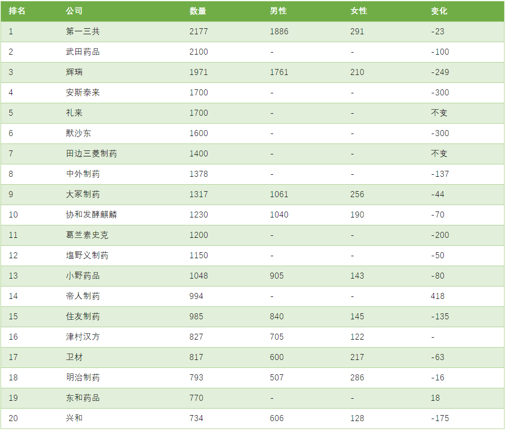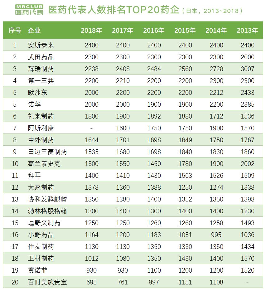 情况是这样的,与往年一样,医药信息速递杂志对在日各药企进行了 2020 年医药代表人数问卷调查,并在 6 月号杂志列出了医药代表人数最多的 20 家药企,名单如下: