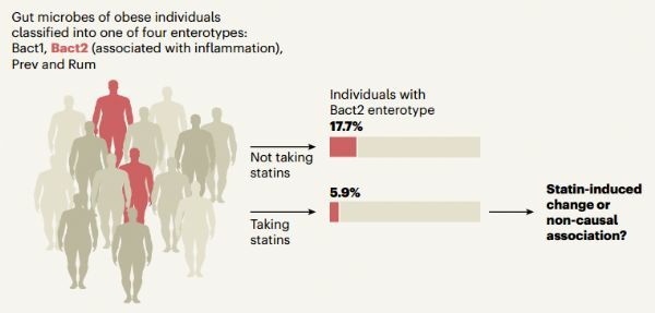 代谢性疾病的风险。除了有降低胆固醇的作用外,他汀类药物还能缓解患者的全身炎症。现在,Vieira-Silva和他的同事已经发现了他汀类药物对肠道菌群的另一种潜在的有益作用。在肥胖人群中,服用他汀类药物的人群(6%)出现肠道菌群失调型Bact2的概率明显低于未服用他汀类药物的人群(19%)--与非肥胖人群(4%)相当。这些引人注目的观察结果不仅在独立的Faecalibacterium肠道菌群项目数据集中得到了验证,而且在另外一个由280名心血管疾病患者组成的MetaCardis子集中也得到了验证。