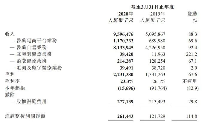 近日,阿里健康发布2020财年业绩公告,数据显示,截止2020年3月31日止,阿里健康该财年总营收95.97亿元,毛利人民币22.3亿元,同比分别增长88.3%和67.6%,净亏损收窄至1570万元,相比去年的9180万元的亏损额缩窄82.9%,经调整后利润净额达到人民币2.6亿元,同比增长114.8%。