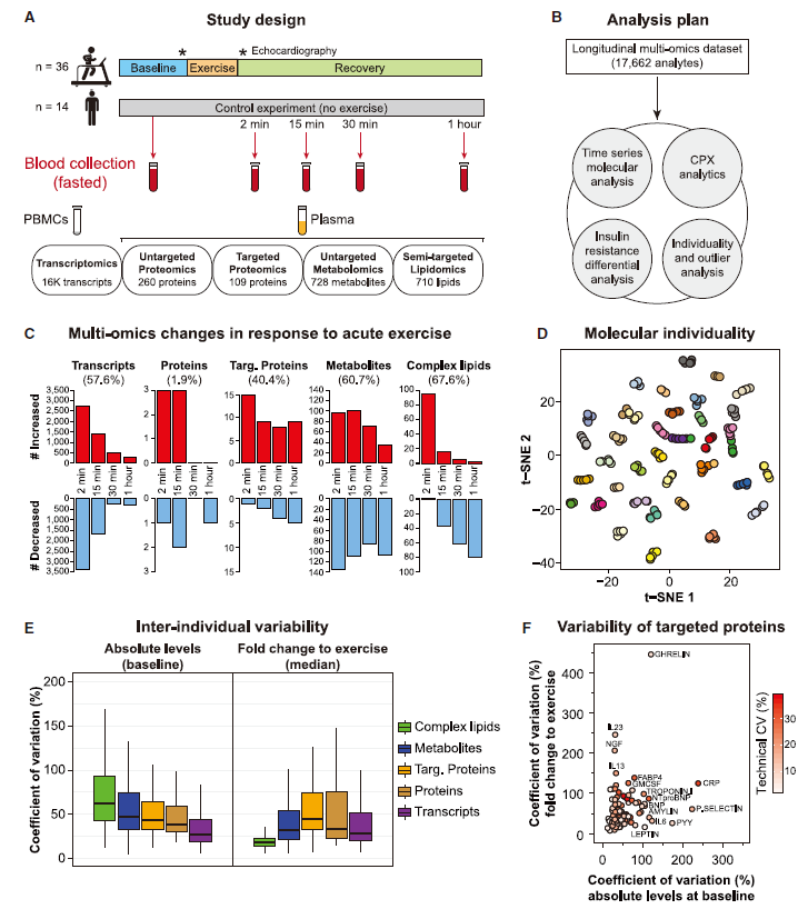 研究人员对36位参与者(其中14名为对照组)进行基线以及运动恢复2、15、30分钟及1小时时连续采血。然后对样品进行血浆蛋白组学、免疫组学、代谢组学、脂质组学和外周血单核细胞(PBMC)的转录组学分析,共获得17662个分析物,其中包括15855个转录本,260种非靶向蛋白质和109种靶向蛋白质,728种代谢物和710种脂质。