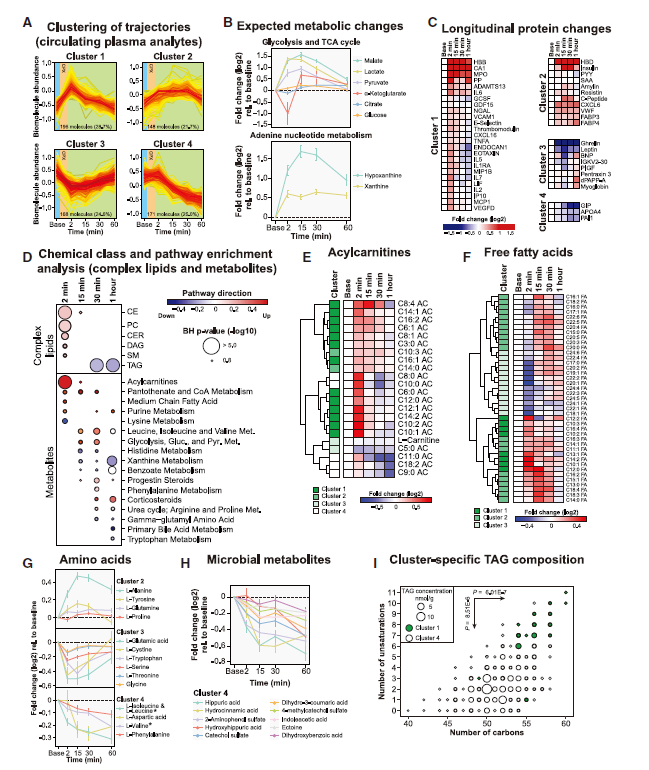 研究人员对运动后的高采样密度,使用c-means聚类,将变化的物质分为四个簇,第1簇在运动后增加并迅速回到基线,主要富含与厌氧代谢,免疫反应,氧化应激,脂肪酸氧化和脂质代谢相关的分子,参与燃脂、修复骨骼肌损伤及促炎等;第2簇为在运动后延迟增加,直到回到基线,与碳水化合物代谢、类固醇和甲状腺激等的分泌有关,凝血和止血因子也被发现增加;第3簇的分析物随运动而减少,其中一些在1小时内恢复到基线,以瘦素和生长素释放肽为中心,参与调节食欲;第4簇为运动后继续减少,包括支链氨基酸(BCAAs)亮氨酸,异亮氨酸和缬氨酸等,用于修复受损的骨骼肌纤维。