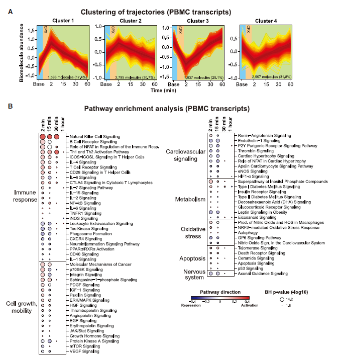 研究人员还对PBMC基因表达分析,以明晰免疫系统的变化。发现基因上调和下调在2分钟时达到最大幅度,在30-60分钟内迅速返回基线。基因富集结果表明,免疫系统被激活,参与免疫反应的B细胞受体,T细胞受体,核因子kB等的表达均显著增加;与细胞生长、肌肉组织的修复和重塑相关的多种途径也被上调。