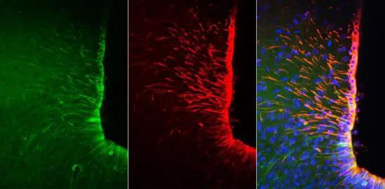 ▲沿着脑室边缘排列的一些伸展细胞(红色标记)中有一些表达了光敏感离子通道(绿色),可以被光照激活(图片来源:参考资料[2];Credit: University of Warwick)