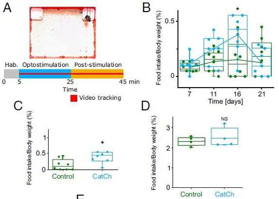 哪一种信号会胜出呢?为了确认伸展细胞被激活后对进食行为的影响,研究人员让小鼠接受食物的检验。录像观察结果显示,刺激伸展细胞后,小鼠在40分钟内食量大增,比对照组小鼠吃得更多、吃得更久。也就是说,伸展细胞激活后,吃得多的冲动压倒了少吃、多消耗的冲动。