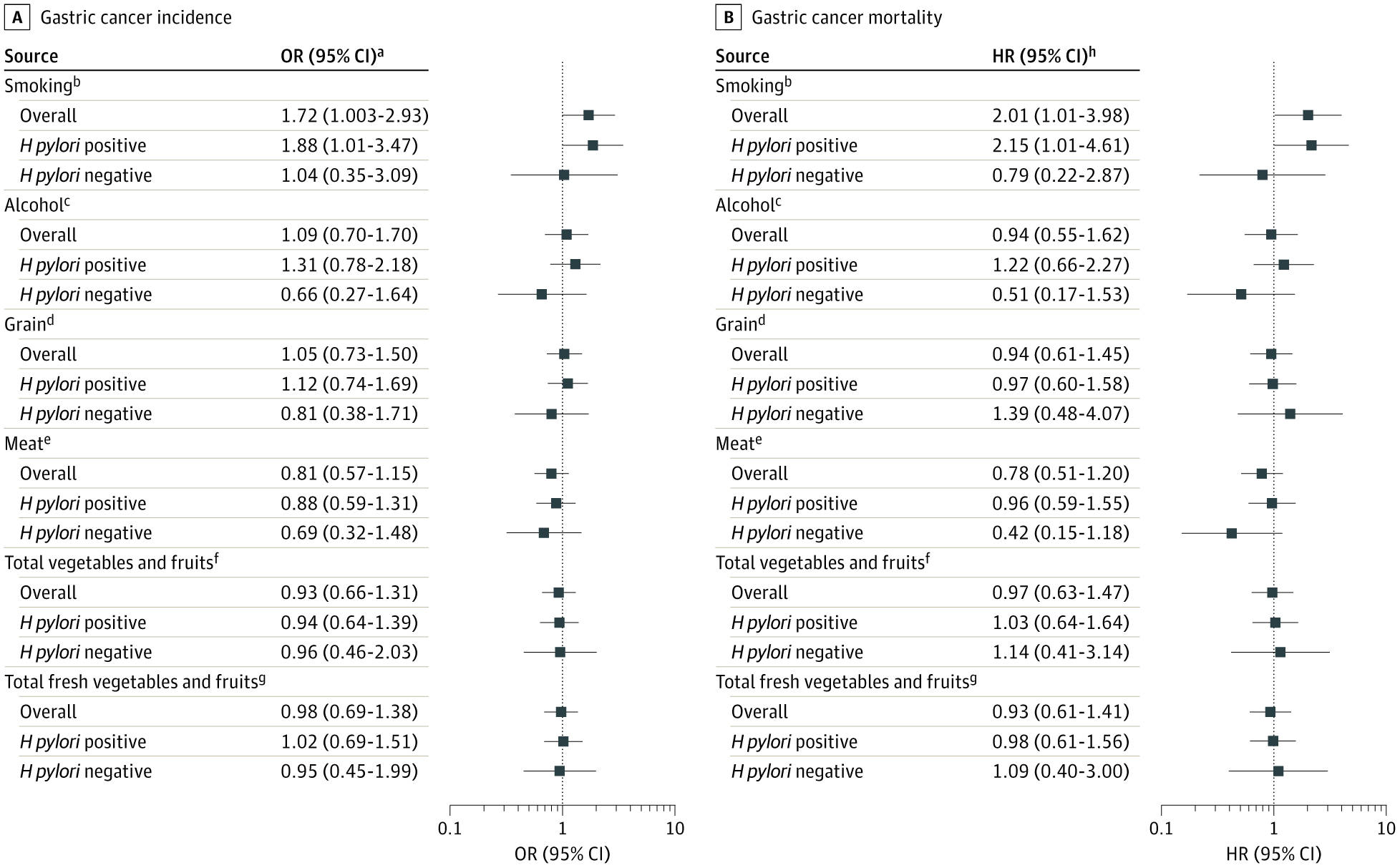 分析结果表明,吸烟是胃部的头号“杀器”,使胃癌发生风险增加了72%,死亡风险则增加了惊人的101%。这种关联在幽门螺杆菌阳性的参与者中更为显著,其胃癌发生率增加了88%,死亡率增加了115%。饮酒以及饮食因素与胃癌之间的相关性并不明显。