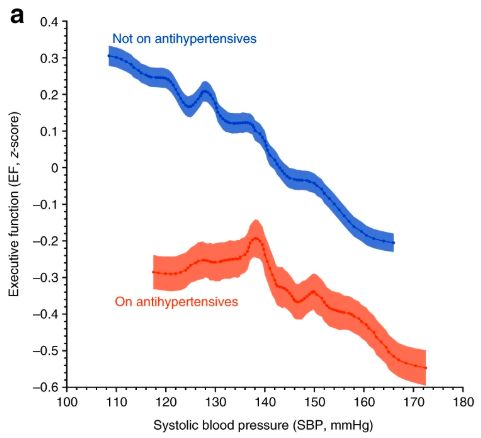 有意思的是,当进一步考虑年龄影响时,随着血压升高而执行功能下降的现象,主要出现在了44–69岁年龄组,而且无论是否已经发展到需要服药,都是如此,在未服药人群中,影响程度还更大。在70岁以上人群中,则没有观察到这一点。