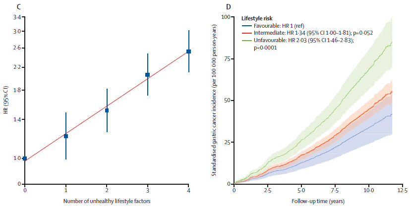 ▲随着不健康生活方式的增加,胃癌风险也显著增加(C);生活方式最差人群的胃癌风险翻倍(D)(图片来源:参考资料[1])