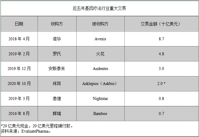 拜耳以40亿美元($20亿现金)收购Askbio:2020年10月,拜耳宣布将以20亿美元前期款项和20亿美元里程碑付款收购AskBio。此前拜耳曾与Ultragenyx合作进行血友病研究,但由于该集团的股价自今年年初以来已经下跌了42%,拜耳需要寻找更多的合作机会。通过此次收购,拜耳将拥有AskBio基因治疗平台的全部权利,可极大地推进了基因治疗管线。拜耳现在危机重重,其最畅销的Eylea和Xarelto将在2024年失去专利保护,另一款重磅产品——避孕药Mirena也已专利到期。虽然此次收购无法解决更为紧迫的问题,但对于推动拜耳发展不失为一件好事。