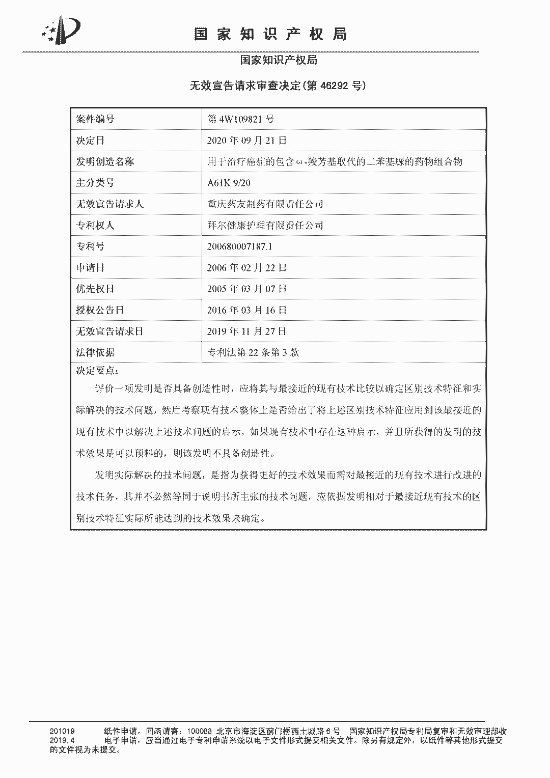 重庆药友两次申请,拜耳甲苯磺酸索拉非尼专利终被宣告无效