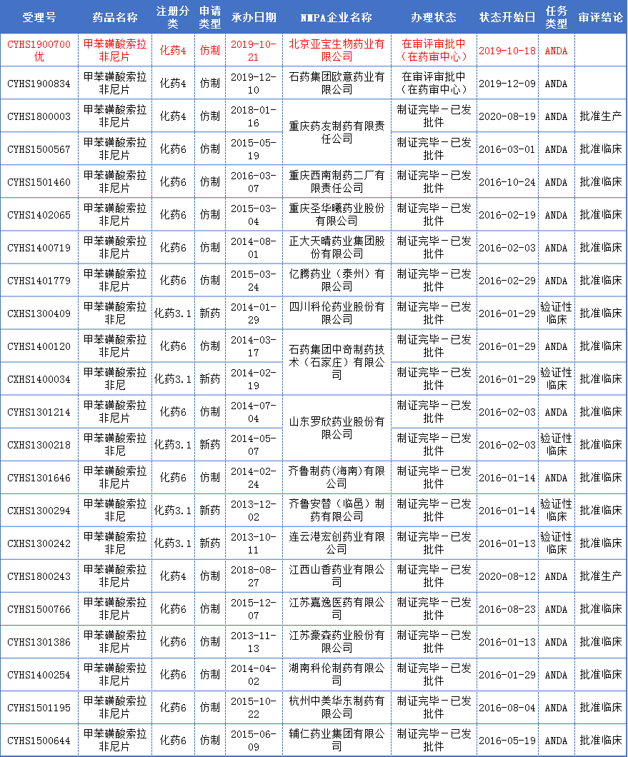 值得提及的是,今年8月青峰医药旗下江西山香药业的甲苯磺酸索拉非尼片首仿获批,随后重庆药友该产品仿制药第二家获批上市;此外,据药智数据显示,索拉非尼产品国内仿制竞争激烈,申报厂家众多,包括豪森、正大天晴、齐鲁、重庆药友、江西山香等20多家国内企业申报了注册申请;除重庆药友、江西山香药业片已获批上市外,石药欧意与亚宝药业也已申报上市获受理,且亚宝药业的该产品申报上市已被纳入优先审评序列,即将快速获批上市。未来更多国产索拉非尼仿制药将陆续上市,加剧市场竞争。