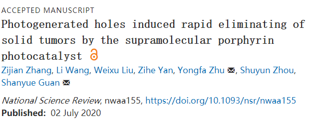 2020年7月2日,清华大学朱永法及中国科学院理化技术研究所Shanyue Guan共同通讯在National Science Review 在线发表题为“Photogenerated holes induced rapid eliminating of solid tumors by the supramolecular porphyrin photocatalyst”的研究论文,该研究建立了一种超分子光催化剂Nano-SA-TCPP,可在600-700 nm波长下进行照射,治疗实体瘤,实体瘤(100 mm3)可以在10分钟内消除。