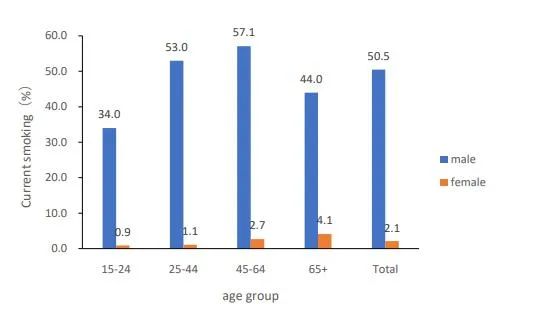 造成这种差距的背后,吸烟是主要的危害因素,根据中国《全球成人烟草调查》,目前我国成年人吸烟率约为26.6%(男性约占50.5%,女性约占2.1%),而目前仅有16.1%的吸烟者计划或正在考虑在未来12个月内戒烟。