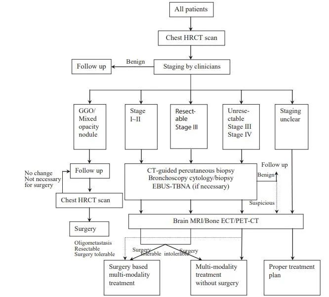 近年来,以高分辨率计算机断层扫描、PET-CT、支气管镜检查、经皮肿瘤穿刺术等技术发展,提高了肺癌的精准诊断和分期的准确性。PET-CT不仅对于评估整体,特别是对于可能的远端转移,而且对于发现一些难以用CT诊断的病变都是很高的价值。病理活检是确诊癌症的“金标准”,支气管镜检查对于在中心型肺癌中进行活检或刷式细胞学检查标本具有很高的价值,通过病理学可以确认95%以上的病变。
