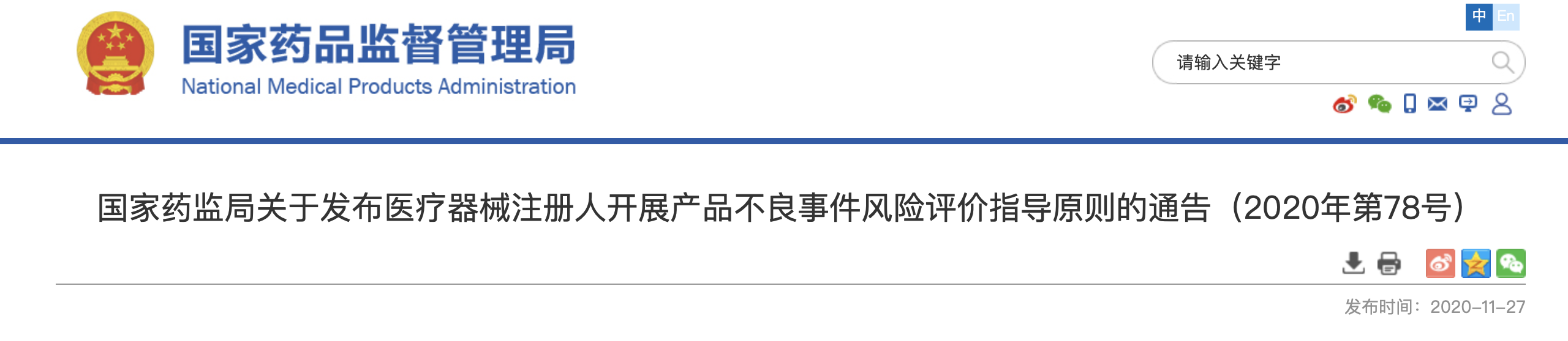 11月27日,国家药监局发布《医疗器械注册人开展产品不良事件风险评价指导原则》的通告,据悉该原则主要为了规范并指导医疗器械注册人开展医疗器械上市后风险评价,本指导原则所称注册人与《办法》中所称医疗器械上市许可持有人内涵相同。