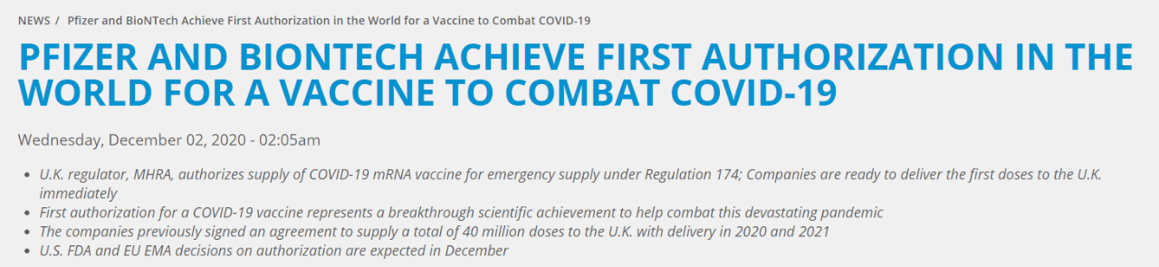 12月2日,辉瑞/BioNTech宣布英国药品和健康产品管理局(MHRA)给予其mRNA新冠疫苗BNT162b2紧急使用临时授权(temporary authorization),这是全球首个给予BNT162b2紧急使用授权的国家。辉瑞/BioNTech表示未来几天至几周,有望在全球更多国家获得紧急使用授权,双方也已经做好了疫苗供应准备。