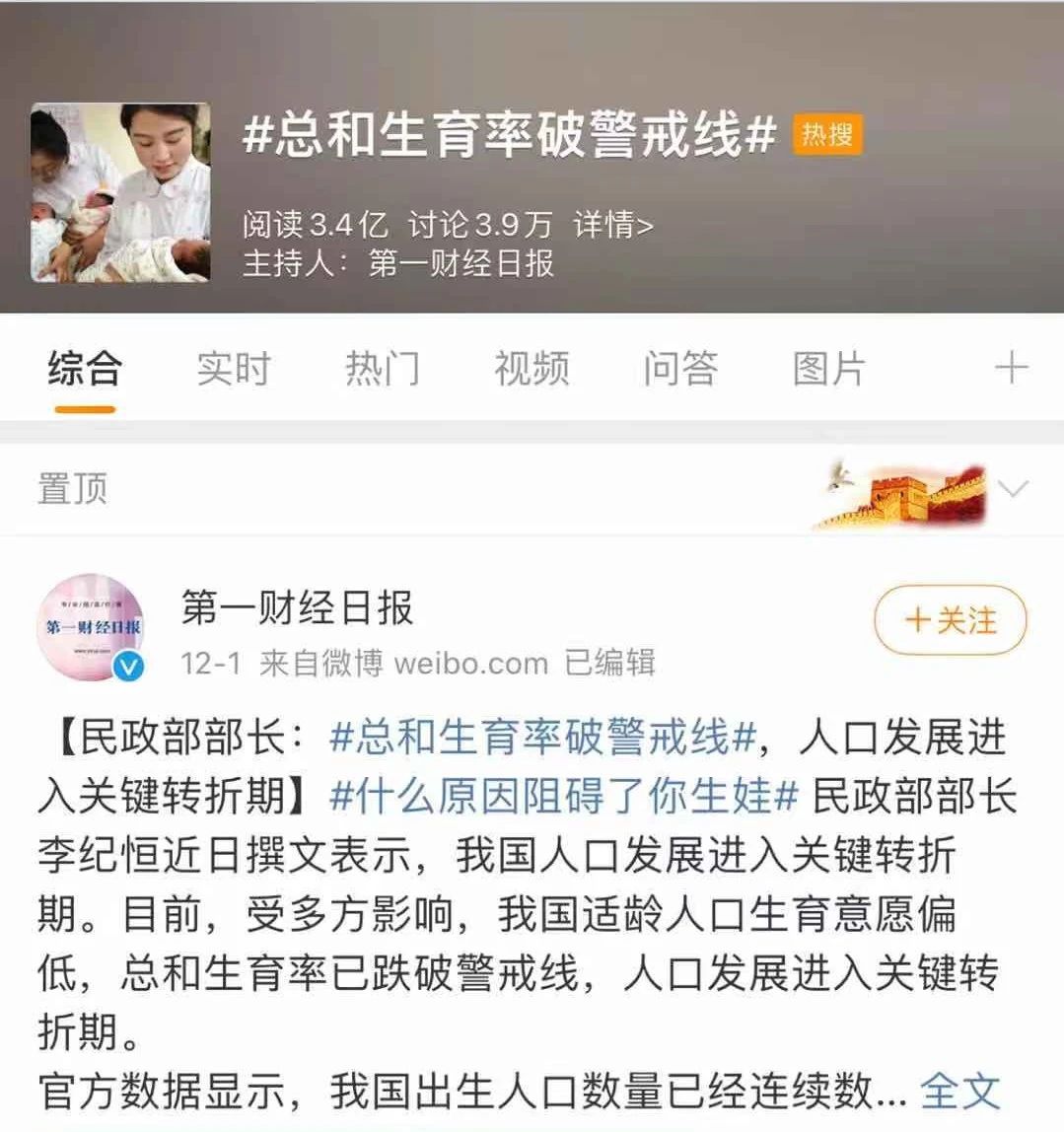 12月1日,“总和生育率破警戒线”的消息登上了微博热搜并引发人们热议。微博中提到,民政部部长李纪恒近日撰文表示,我国适龄人口生育意愿偏低,我国人口发展步入了关键转折期,新生人口数量已经连续数年下降!