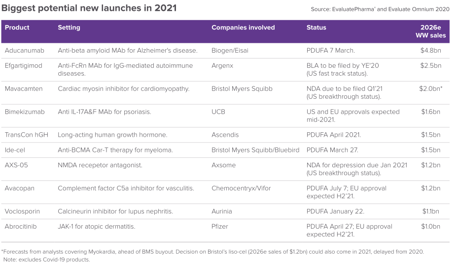 如果获得批准,ide-cel将成为第一款上市的BCMA CAR-T细胞疗法。Evaluate Vantage预测,ide-cel在2026年的全球销售额将达到15亿美元。目前,百时美施贵宝还有一款自体CD19 CAR-T细胞疗法liso-cel正在接受美国FDA的审查,但在今年11月,FDA表示无法在PDUFA目标日期2020年11月16日前完成审查,原因是COVID大流行导致无法对liso-cel的第三方生产设施进行检查。FDA并没有提供新的PDUFA日期,因此,liso-cel有可能在2021年获批上市,Evaluate Vantage预测,liso-cel在2026年的全球销售额将达到12亿美元。
