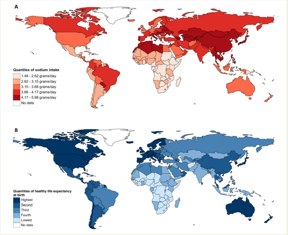 然而,近日来自美国纽约大学和瑞士伯尔尼大学的研究人员在《European Heart Journal》上发表了一项题为Sodium intake, life expectancy, and all-cause mortality的研究成果,其发现钠摄入量与预期寿命呈正相关性,同时也与世界范围内以及高收入国家的全因死亡率成反比,这一结果与前期研究刚好相反!