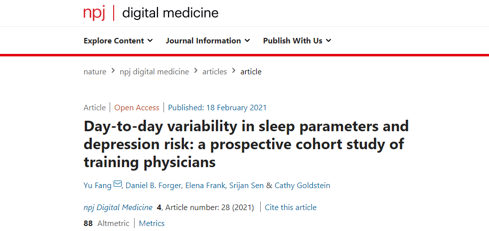 相关研究论文以 “Day-to-day variability in sleep parameters and depression risk: a prospective cohort study of training physicians” 为题,于 2 月 18 日发表在科学期刊 NPJ Digital Medicine 上。