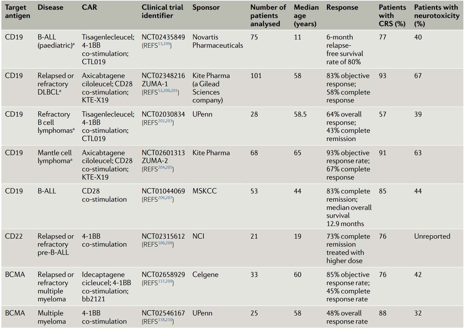 表1 | 主要的已发表CAR-T细胞疗法试验