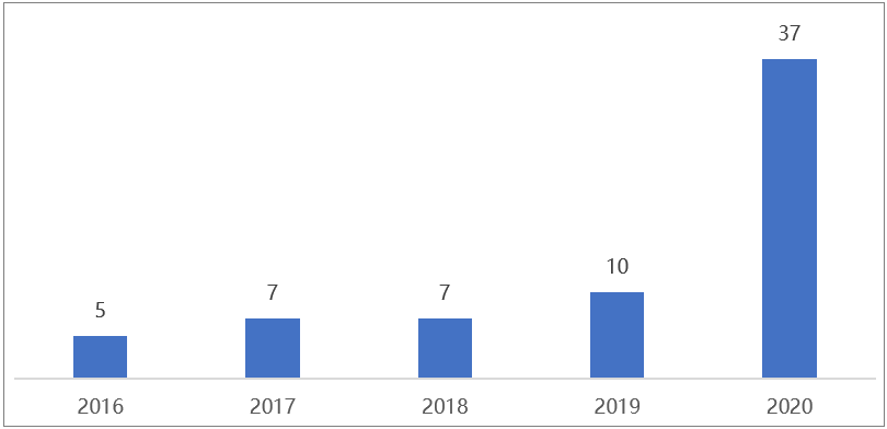 国内生物制药公司向海外公司许可(license out)项目的交易案例越来越多也可视为中国制药产业实力大幅提升的标志性事件之一。据医药魔方不完全统计,2017~2020年间中国生物制药公司对外license out的案例已经有39起,这个数字是2006~2016这10年之间发生license out交易案例数的3倍。