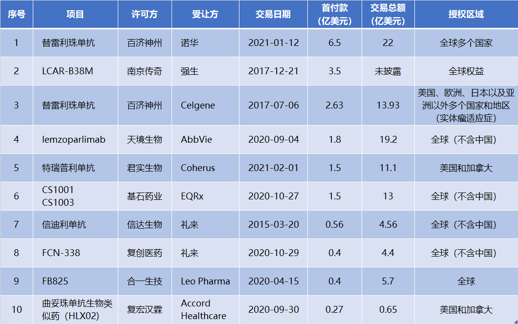 从首付款TOP10的创新药交易来看,除复宏汉霖的曲妥珠单抗生物类似药之外,其余license out项目主要是创新单克隆抗体项目和细胞疗法,受让方中则不乏强生、诺华、礼来这样的跨国巨头。