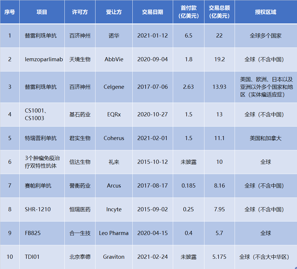 从交易总额TOP10的创新药交易来看,百济神州、天境生物与跨国药企之间的交易在不断刷新纪录。位居首位的是,百济神州与全球制药巨头诺华今年1月就替雷利珠单抗在多个国家的开发、生产与商业化达成合作与授权协议,预付款为6.5亿美元,里程碑付款为15.5亿美元,总交易金额超过22亿美元。