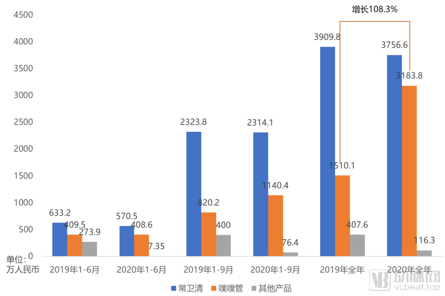 但是当数据来到全年,常卫清实现的营收与2019年几乎持平,考虑到发货到收入确认之间的时间差,和上半年受疫情影响的常卫清发货量,从收入角度看常卫清2020年销售应当是平的;除常卫清和噗噗管以外的其他产品有较大下滑,但是因为销售额较低,对诺辉健康的总体收入影响不大;噗噗管的增长则非常明显,2020年销售额较2019年增长一倍有余,并且2020年噗噗管的销量中,四季度销量超过2000万元,约占全年销量的65%以上。