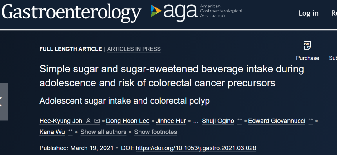 近日,来自美国哈佛公共卫生学院和韩国首尔国立大学医学院的研究人员在《Gastroenterology》 上发表了题为Simple sugar and sugar-sweetened beverage intake during adolescence and risk of colorectal cancer precursors的研究成果,发现青春期大量摄入高糖食物和SSB,会显著增加常规腺瘤及高危腺瘤,尤其是直肠腺瘤的患病风险。