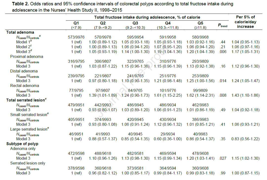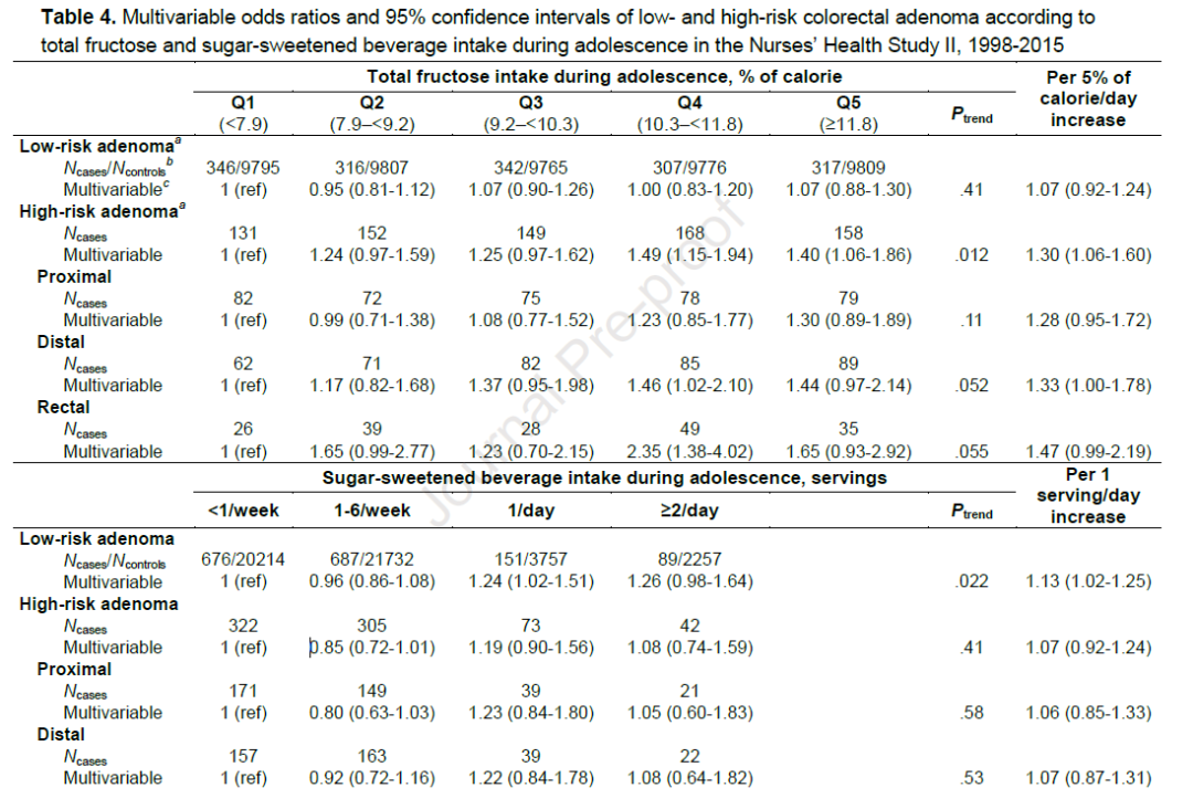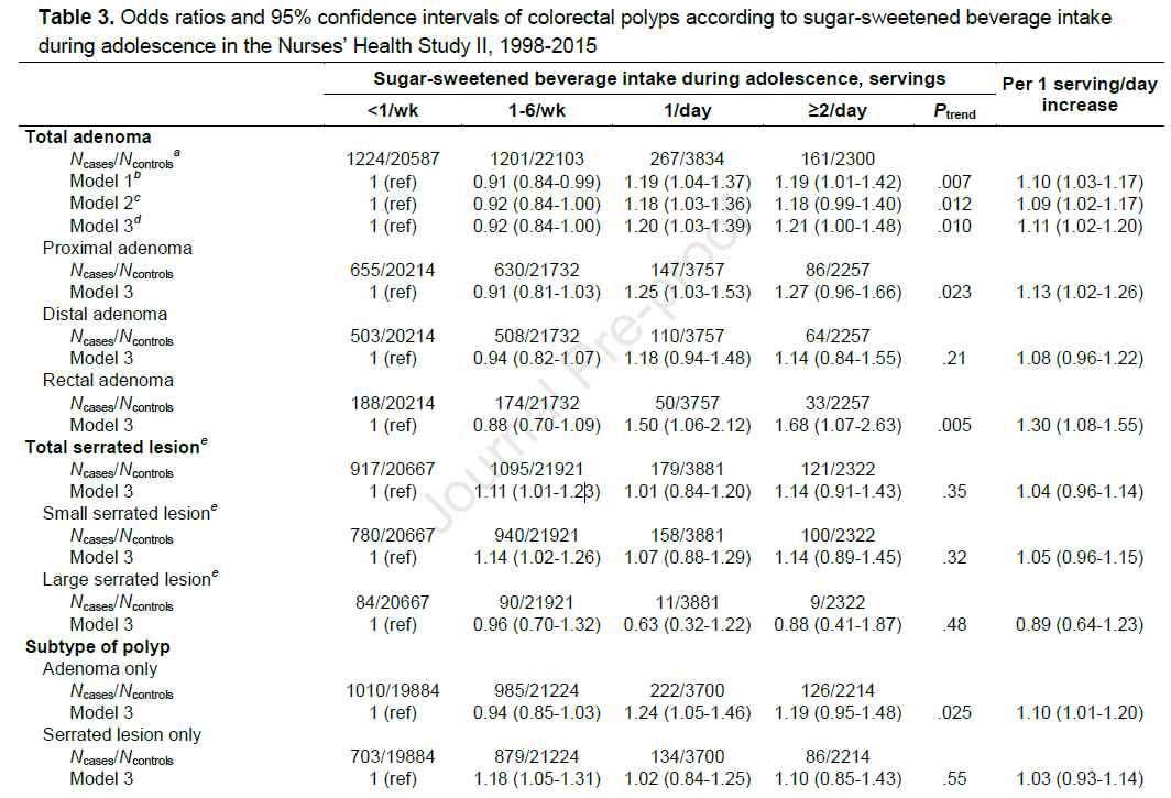 对参与者的饮食调查结果显示,有12.6%和4.8%的参与者在青春期分别至少摄入一份及两份SSB/天,其果糖和SSB摄入量平均约占每日卡路里的2.6%,显著高于成年参与者,且SSB摄入量较高的人更喜欢食用红肉,而水果和蔬菜摄入很少。在随访期间,共有4744名妇女被诊断出至少有一个结肠直肠息肉,其中2909名参与者患有腺瘤(近端1548例,远端1205例,直肠458例和758例高危腺瘤),超过2355名参与者被检查出患有锯齿状病变。