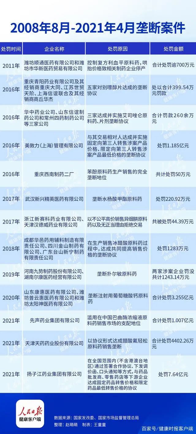 2021年4月15日,国家市场监管总局根据《反垄断法》第四十六条、四十九条规定,对扬子江药业作出行政处罚决定,对其处以其2018年销售额254.67亿元3%的罚款,计7.64亿元。