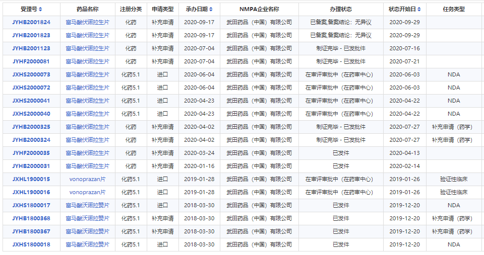 2018年3月,国家药品监督管理局药品审评中心正式受理了武田富马酸伏诺拉生片在国内的首次上市申请。