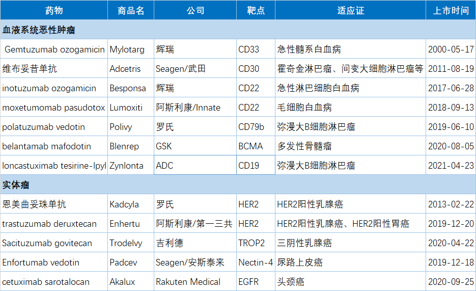 目前,全球共有12款ADC药物获批上市,其中7款用于治疗血液系统肿瘤,5款用于治疗实体瘤。