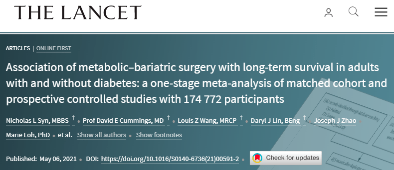 [1] Nicholas L Syn, et al., (2021). Association of metabolic–bariatric surgery with long-term survival in adults with and without diabetes: a one-stage meta-analysis of matched cohort and prospective controlled studies with 174 772 participants. The Lancet, DOI: https://doi.org/10.1016/S0140-6736(21)00591-2