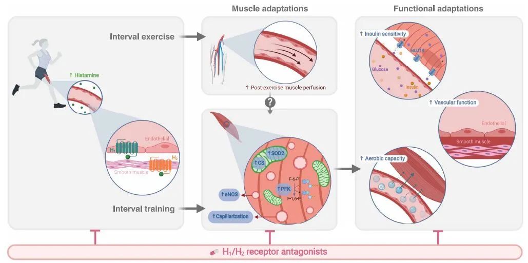 ▲组胺受体调节运动适应性的机制示意图:有氧运动期间和之后,循环系统中增加的组胺激活位于骨骼肌和血管的组胺受体H1和H2,有助于提升整体健康(图片来源:参考资料[1])