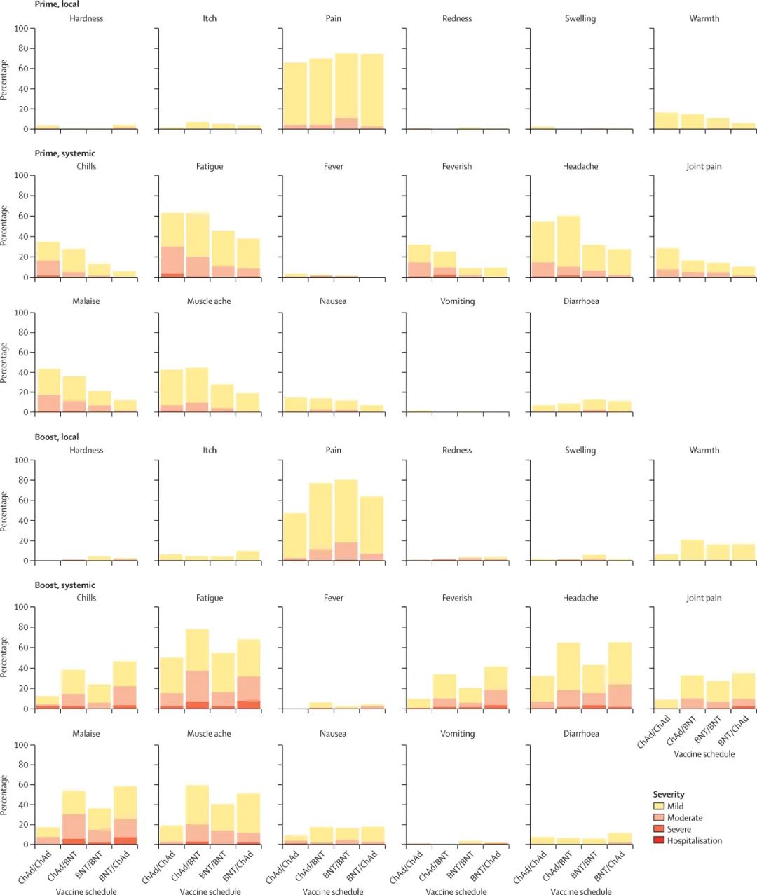 ▲在第一针接种7天内(prime,前三行)和第二针接种7天内(boost,后三行),受试者自我报告的局部和全身反应,以及严重程度。(图片来源:参考资料[1];点击图片可放大查看)