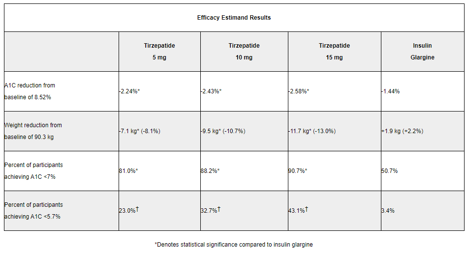 结果显示,SURPASS-4 达到了其主要和主要次要终点。与甘精胰岛素相比,不同剂量 tirzepatide(5 mg,10 mg和15 mg)均导致优越的 A1C 和体重降低。在最高剂量的比,不同剂量 tirzepatide 下,91% 的参与者的 A1C 低于 7%(即美国糖尿病协会推荐给糖尿病患者的目标),43% 的 A1C 低于 5.7%(非糖尿病患者的A1C水平)。第 52 周的数据详见下表: