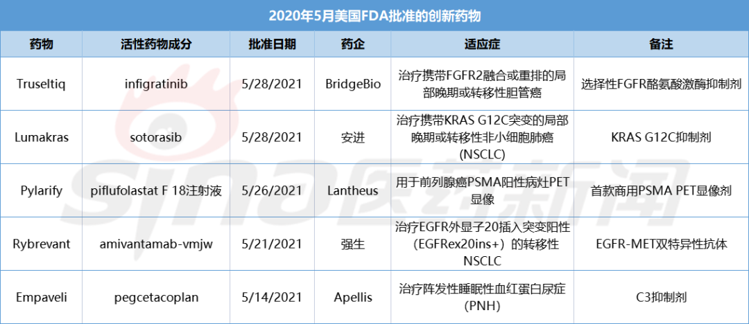 在5月份,美国FDA共批准了5款创新药物(Truseltiq、Lumakras、Pylarify、Rybrevant、Empaveli),去年同期为6款。