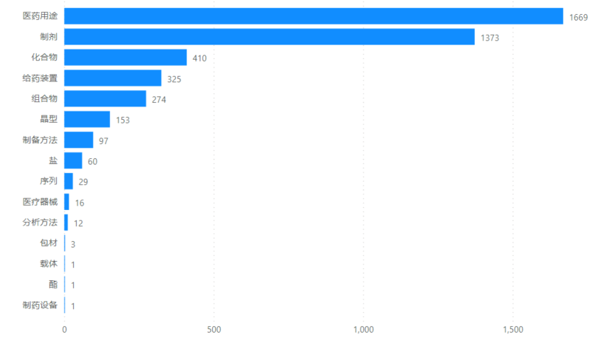 橙皮书专利的提交标准中规定,可以列入橙皮书的专利包括活性化合物、配方、组合物及药品用途等;而制造方法、外包装专利、代谢物、中间体等内容则不可列入橙皮书。从图1的统计结果可见,橙皮书收录的专利以医药用途、制剂、化合物、组合物、给药装置和晶型专利为主(图中的制备方法为计算机NLP识别结果,并非活性化合物的合成方法,而是制剂或给药方法),其中占比最高的两类专利为医药用途和制剂专利。