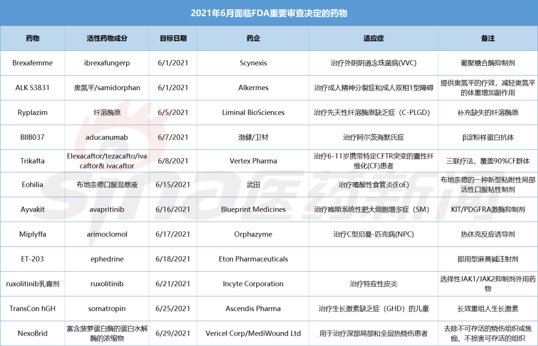 在即将进入的6月份,有渤健/卫材aducanumab、武田Eohilia等多款药物将迎来FDA的重要审查决定。以下对这些药物进行了简单汇总: