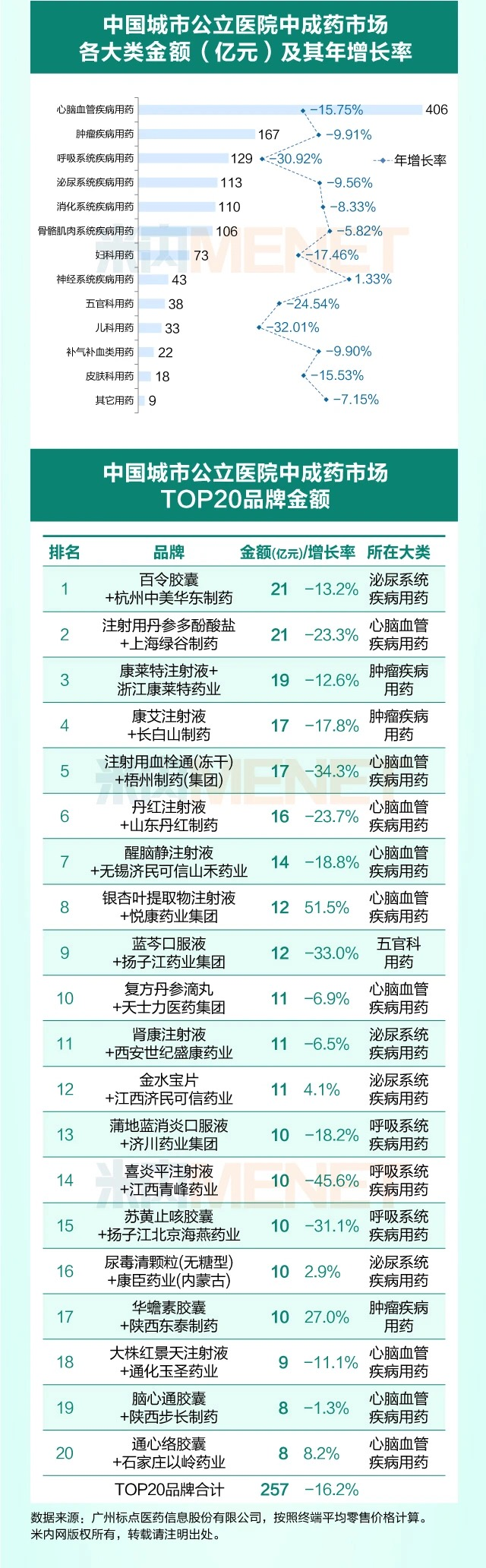 根据米内网数据,在中国城市公立医院中成药市场TOP20品牌金额中,有2个产品销售额超过了20亿元,分别是杭州中美华东制药的百令胶囊、上海绿谷制药的注射用丹参多酚酸盐。据不完全统计,注射用丹参多酚酸盐、喜炎平注射液均已进入集采。