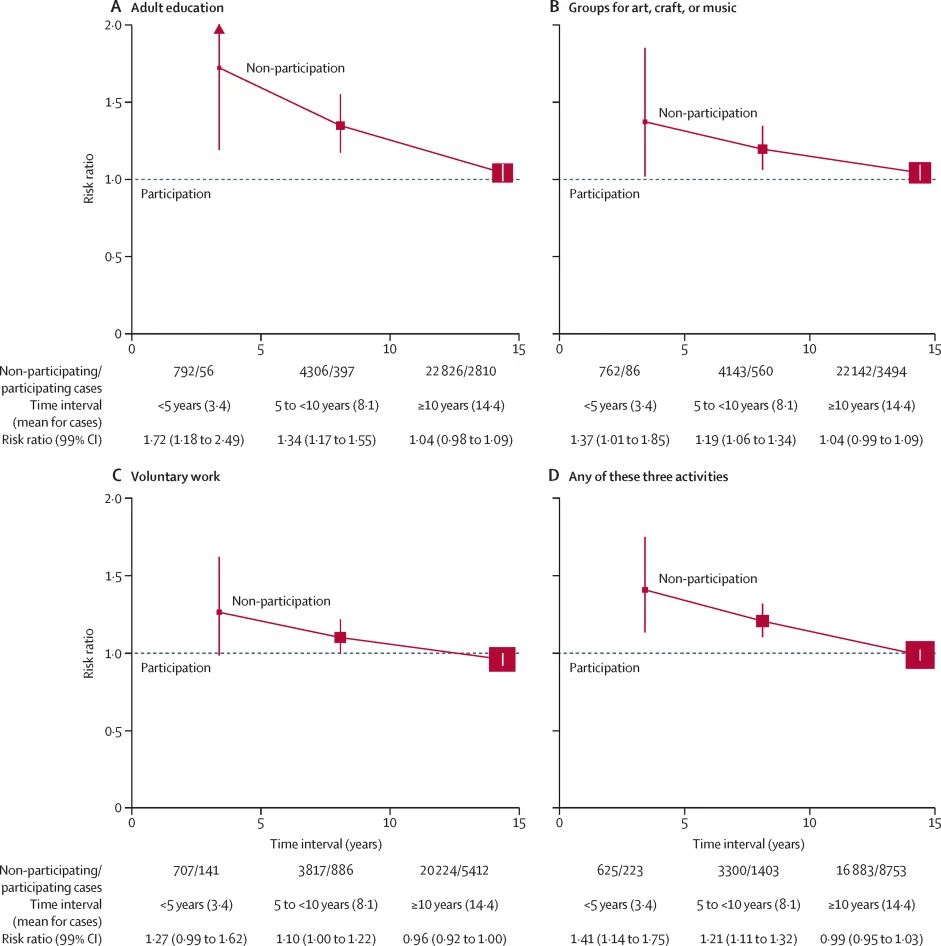 ▲相比参与各种活动(虚线),不参与活动者0-4年、5-9年和10年后得痴呆症(以首次入院记录时间计)的风险。A-成人教育,B-艺术、工艺或音乐团体,C-志愿者工作,D-任何三种活动之一。