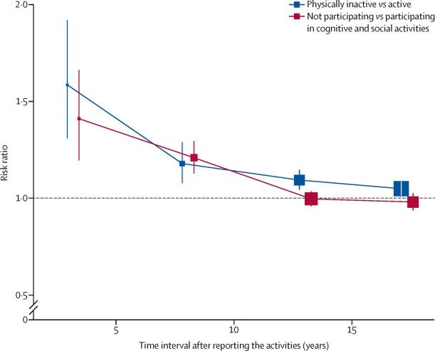 分析发现,从第一次收集活动参与信息后,只有在第一个十年里,不参与认知或社交活动与更高的痴呆症风险有关;而在第二个十年里,这种关联几乎消失了。