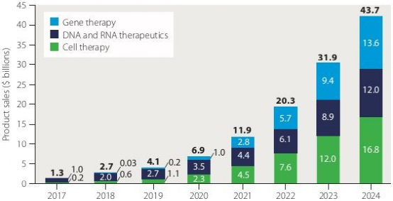 根据Evaluate Pharma数据,全球细胞疗法、基因疗法及核酸疗法的市场规模将以65%的年复合增长率,从2017年的13亿美元迅速增至2024年的437亿美元。