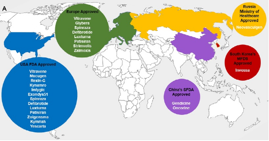 图3. 截至2019年5月全球获批的细胞、基因及核酸疗法