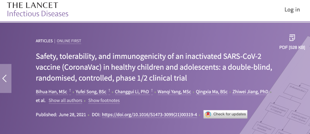 2021年6月28日,发表在《柳叶刀传染病》杂志上的一项针对 550 名参与者的随机对照试验发现,两剂科兴新冠疫苗CoronaVac 在 3-17 岁的儿童和青少年中是安全的,并且会引起强烈的抗体反应。这是全球首个发布的关于新冠肺炎疫苗在低至3岁儿童中使用的研究结果。