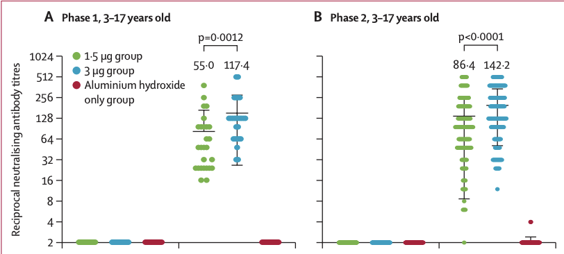 根据实验结果,科兴新冠疫苗CoronaVac 在 3-17 岁的儿童和青少年中具有良好的耐受性、安全性和诱导体液反应。3·0 μg剂量诱导的中和抗体滴度高于1·5 μg剂量。